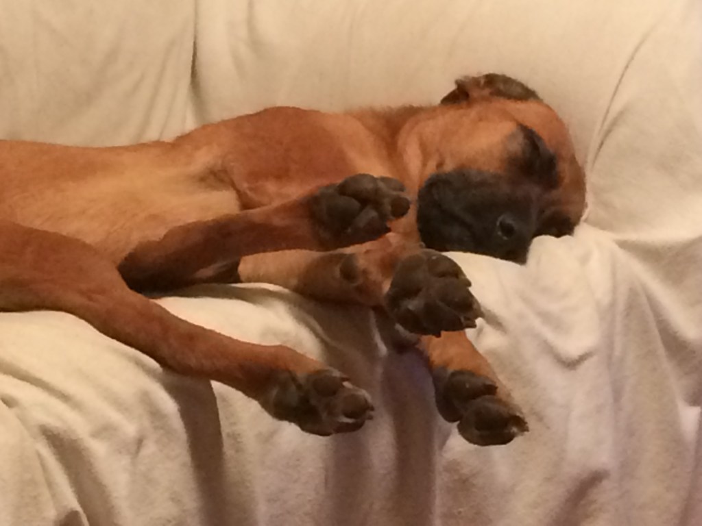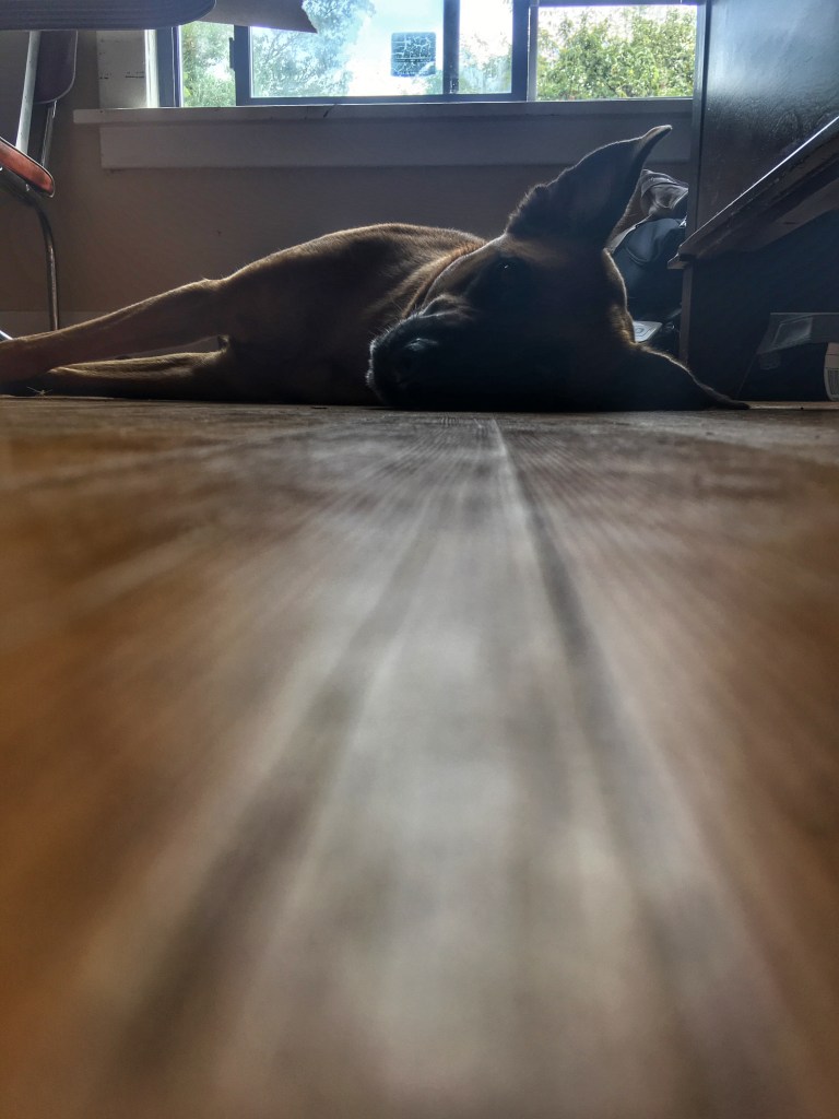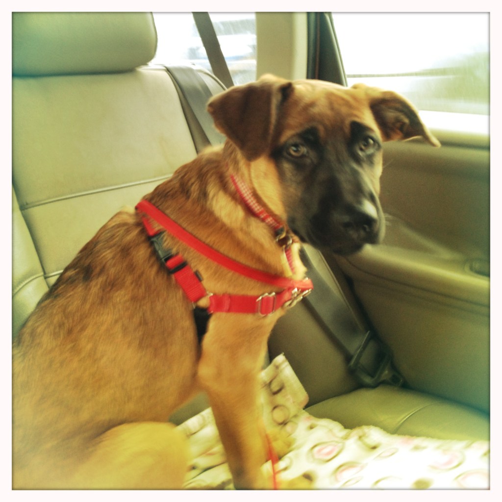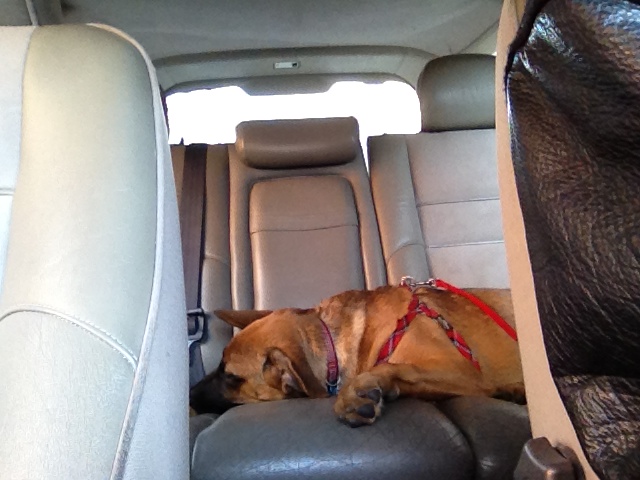 She was a shocking 28lbs on pick-up day. When they brought her out, I actually rebuffed for a second asking, “where’s the puppy?” Her now long body waggled as we walked to the car. Half way home, she was asleep. Great in the car, check. Mellow, check.
