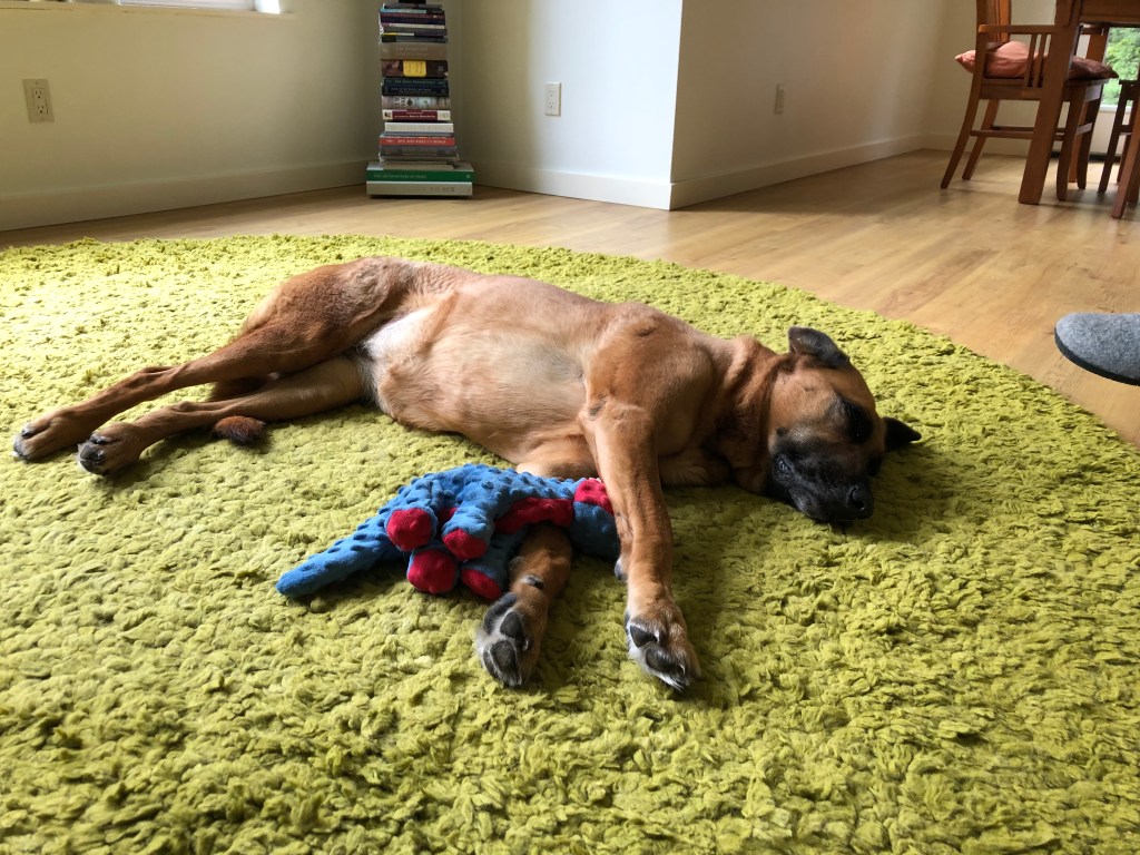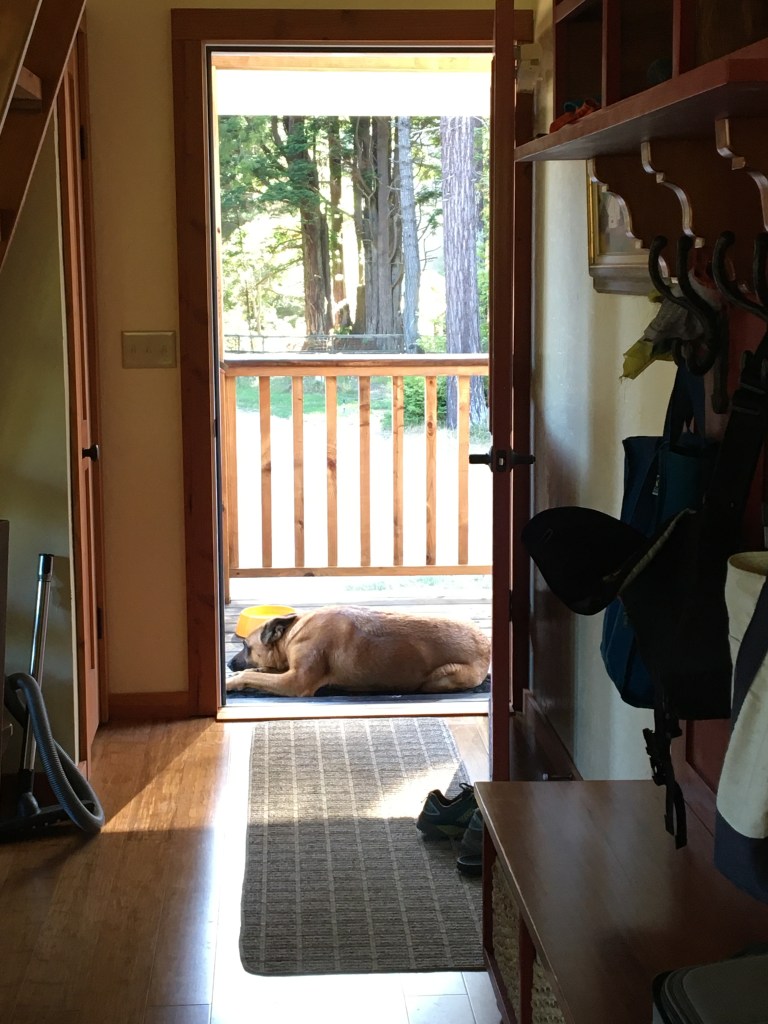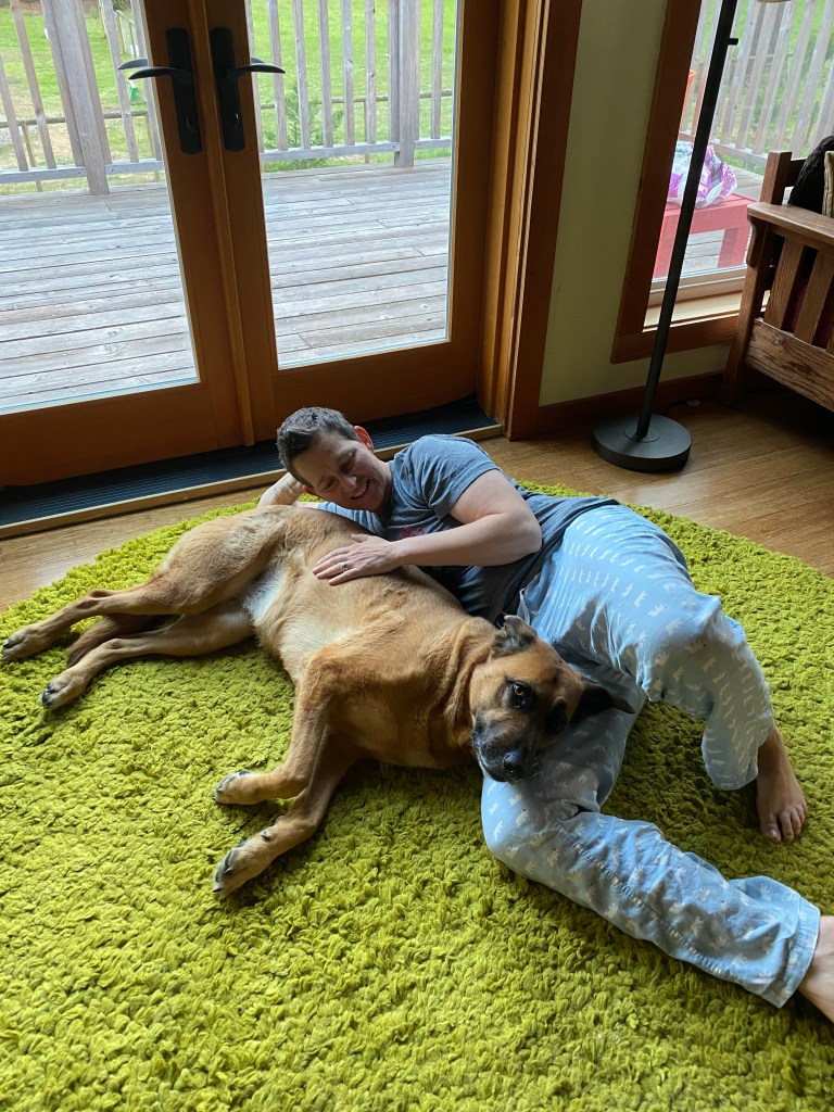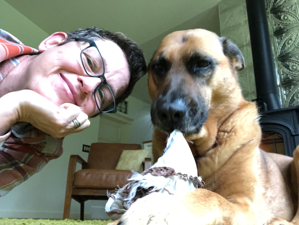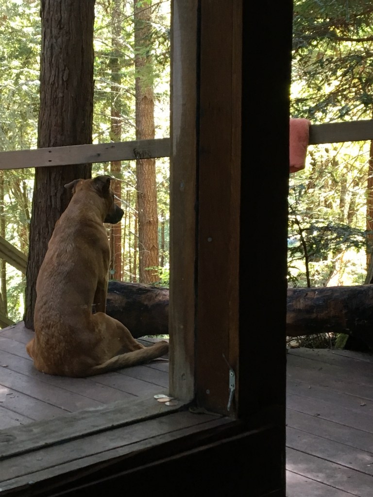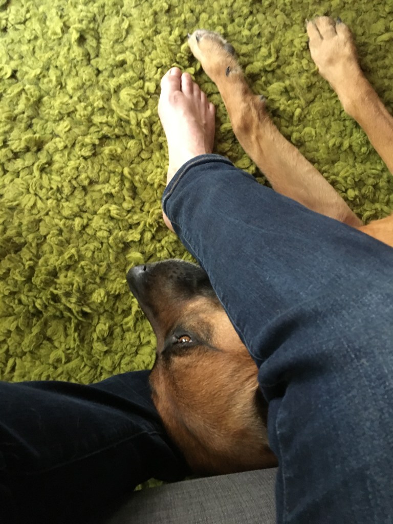 I miss everything about her. I miss being greeted. I miss her coming to the bed to nudge me out. I miss her expectation and efficiency of licking the plates and bowls after meals. I miss her staring at me as I shuffle across a dark kitchen to make tea, but was always encouraged to (and did) make her a fire first. I miss watching her roll onto her back in the grass, esp when chewing a stick. I miss porch sitting with her. I miss being stared at so intensely that I’m convinced she is a.) the best human trainer in the world and b.) she knows all the secrets of the universe. I miss her big sweet head in my lap as we three sat on the couch watching a show. I especially miss her shoving further and further across to be not only in my lap but now partially in Laura’s. I miss the way she would fall asleep on the couch and her head would lift the moment she heard the spoon scrape the bottom of the ice cream container. I miss feeding her chicken off the bone in the kitchen, and how gentle she could be even when ravenous. I miss her singing at the beach, insistent we throw a stick or stone. I miss kicking a ball and watching the worlds best dog goalie. I miss how she would put her paw on my foot when she wanted something I had. I miss the days long ago when she would jump back on the bed in the morning, wrestle with me making amazingly scary growling noises, would stop when I said ‘wait’ and launch off the bed like a dog rocket when I’d say “lets go”. I miss how saying the words “let me get my pants” was code for going for a walk. I miss the smell of her head, the groan she made when scratching her ear, the funny noises she made in her sleep and her gentle snore that signaled I could fall asleep.